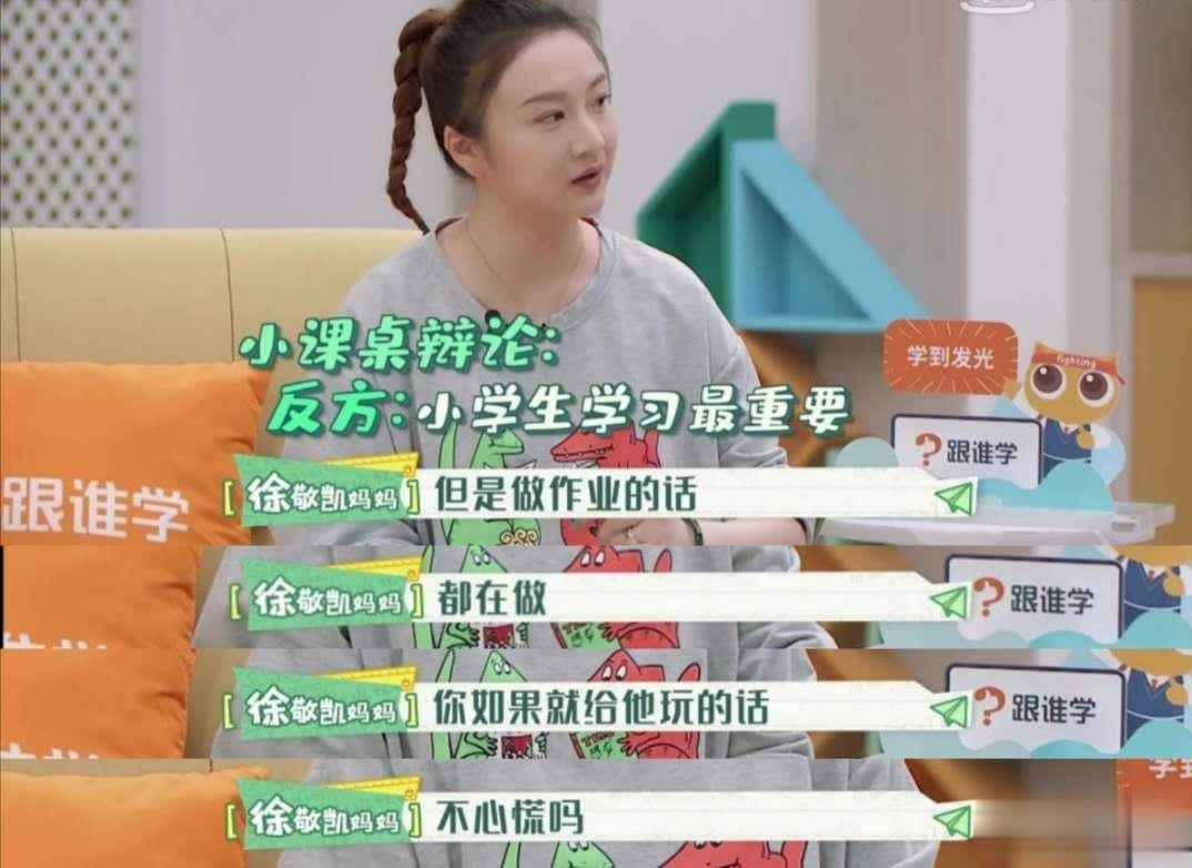 当嘉宾们问到凯凯妈妈为何要让一年级的孩子做这么多作业时,凯凯妈妈说出了很多家长的心声,“当看到别人家孩子都做题的时候,你家孩子在玩,难道不焦虑吗?”并且直言自己对孩子要求并不高,前十名就行。